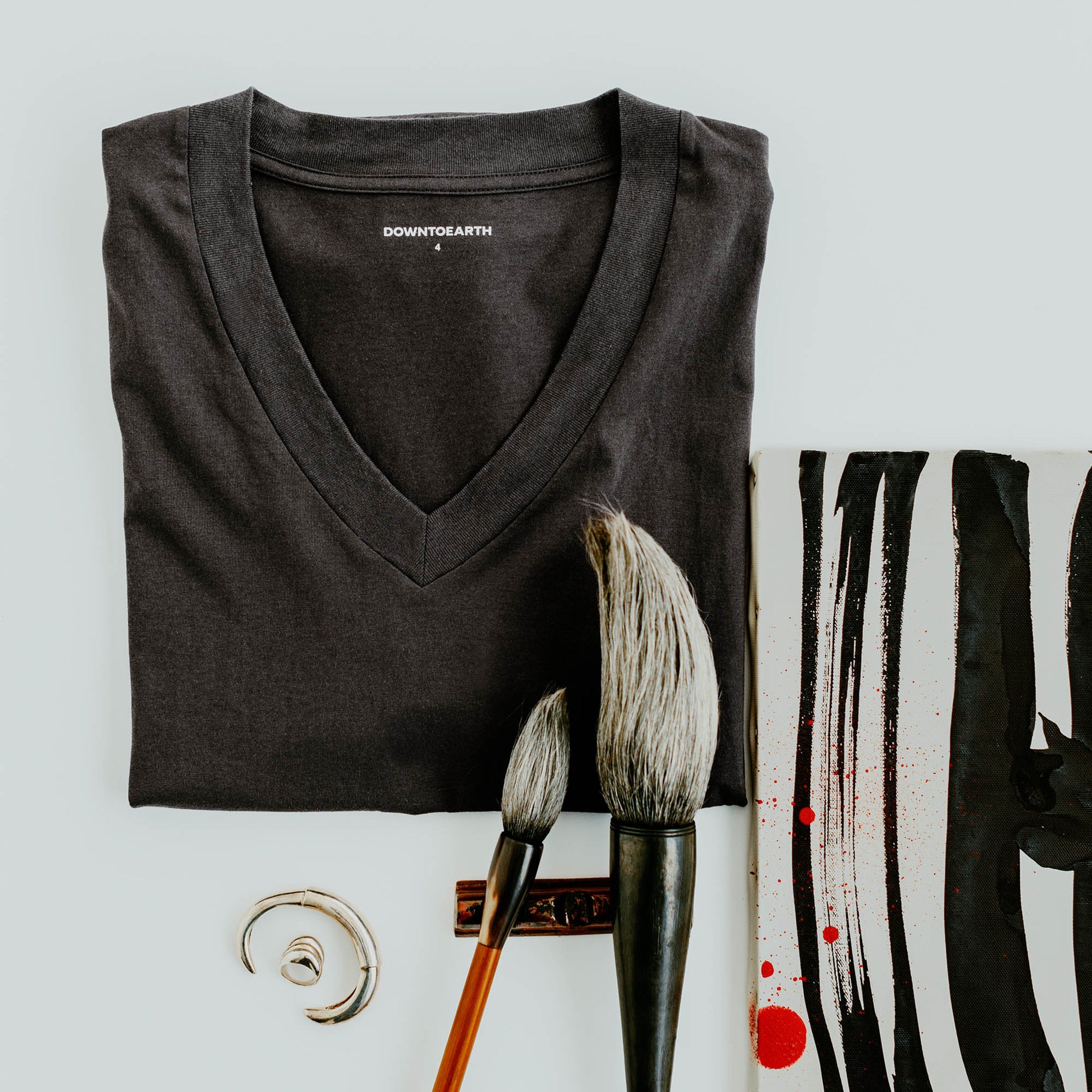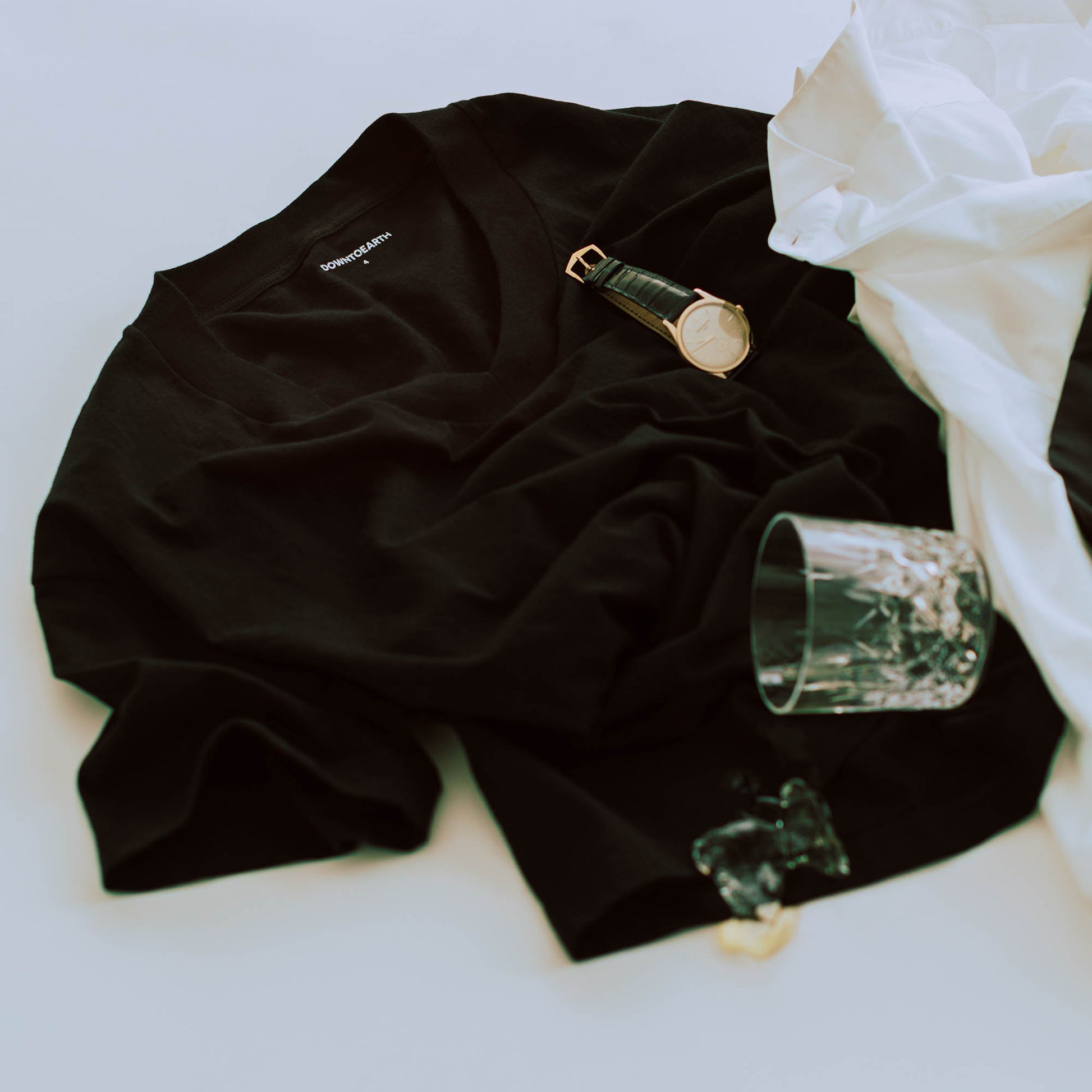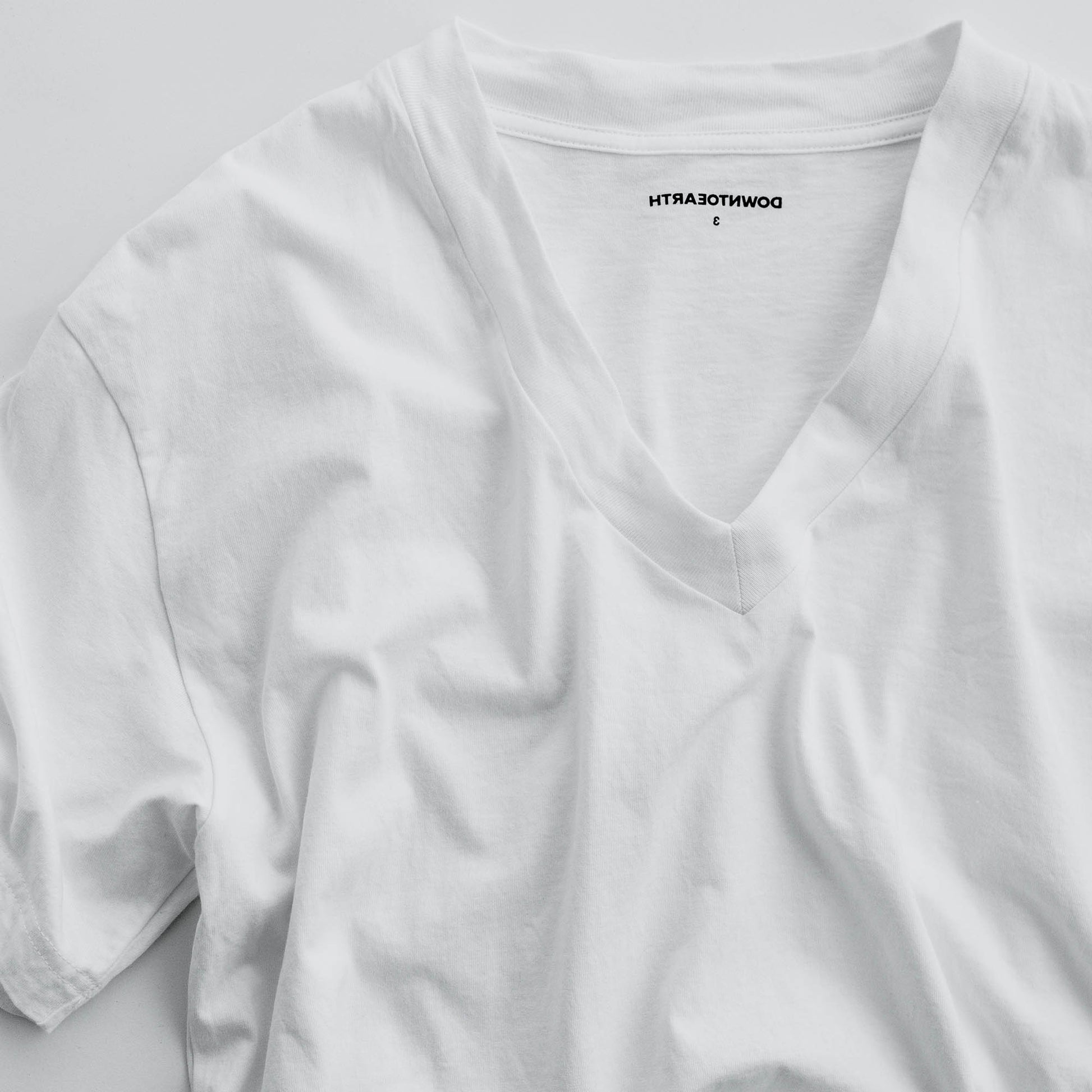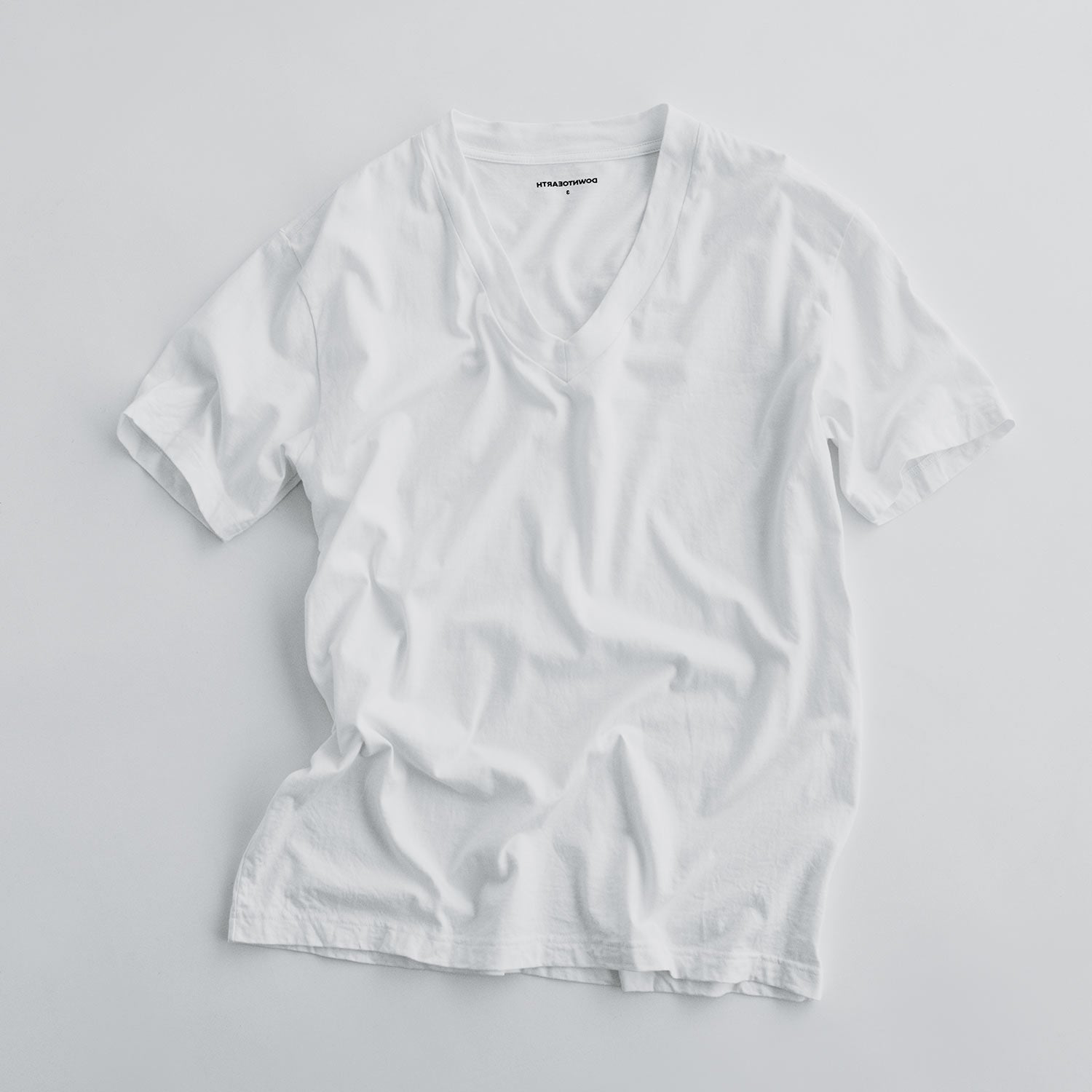 約30㎜の太めのリブが特徴のVネックTシャツ。全体のサイズバランスに加えて着用時の襟の深さと開き具合を細かく調整。リラックス感がありながらだらしなく見えないのが特徴です。